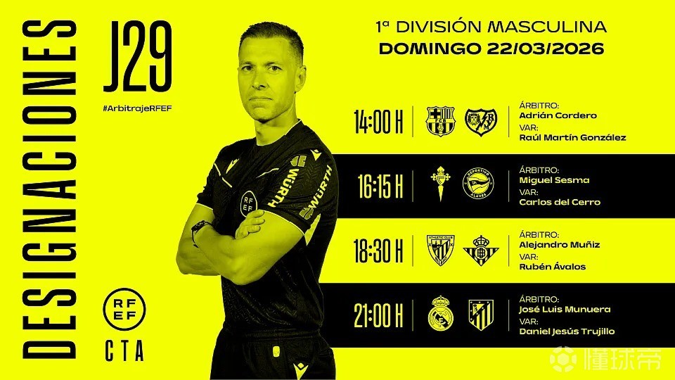 官方公布了西甲第29轮周日比赛的裁判安排,其中马德里德比将由何塞-穆努埃拉担任主裁判,VAR裁判为丹尼尔-特鲁希略。